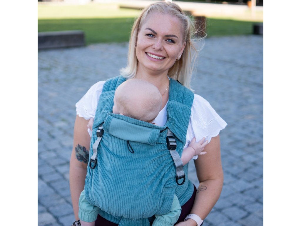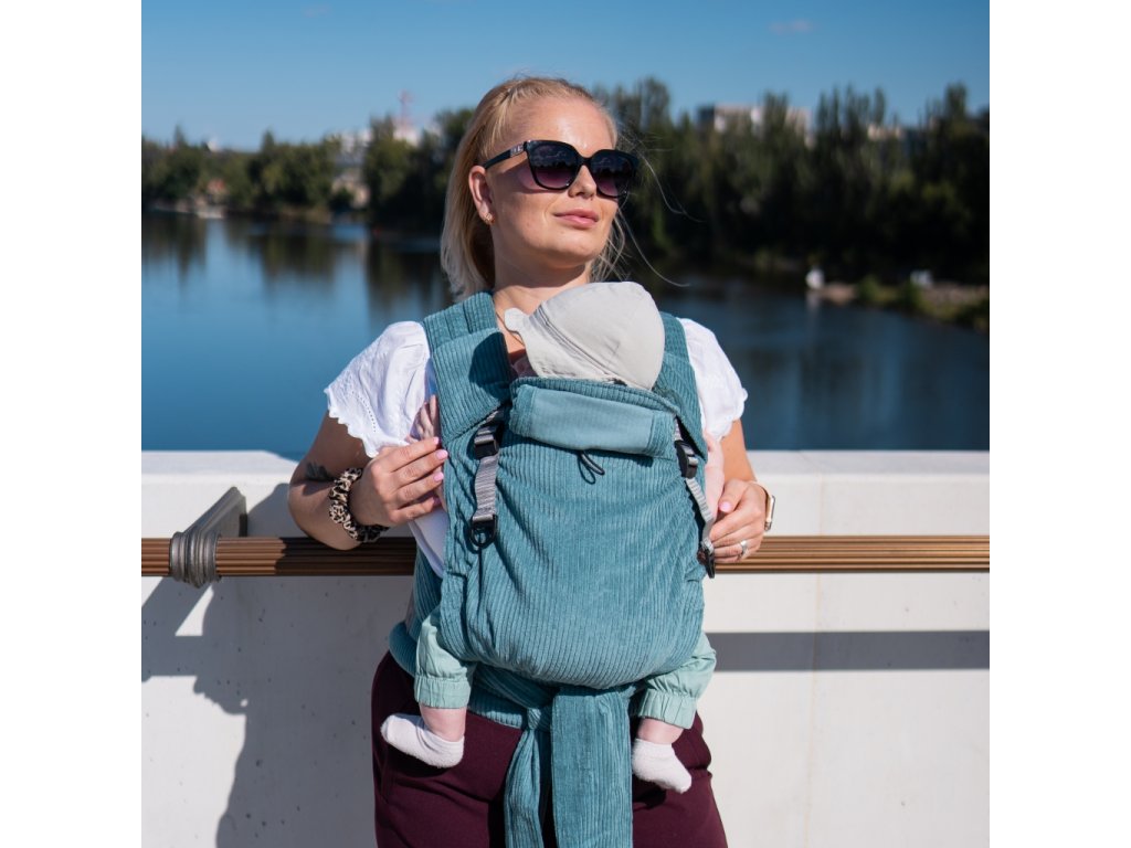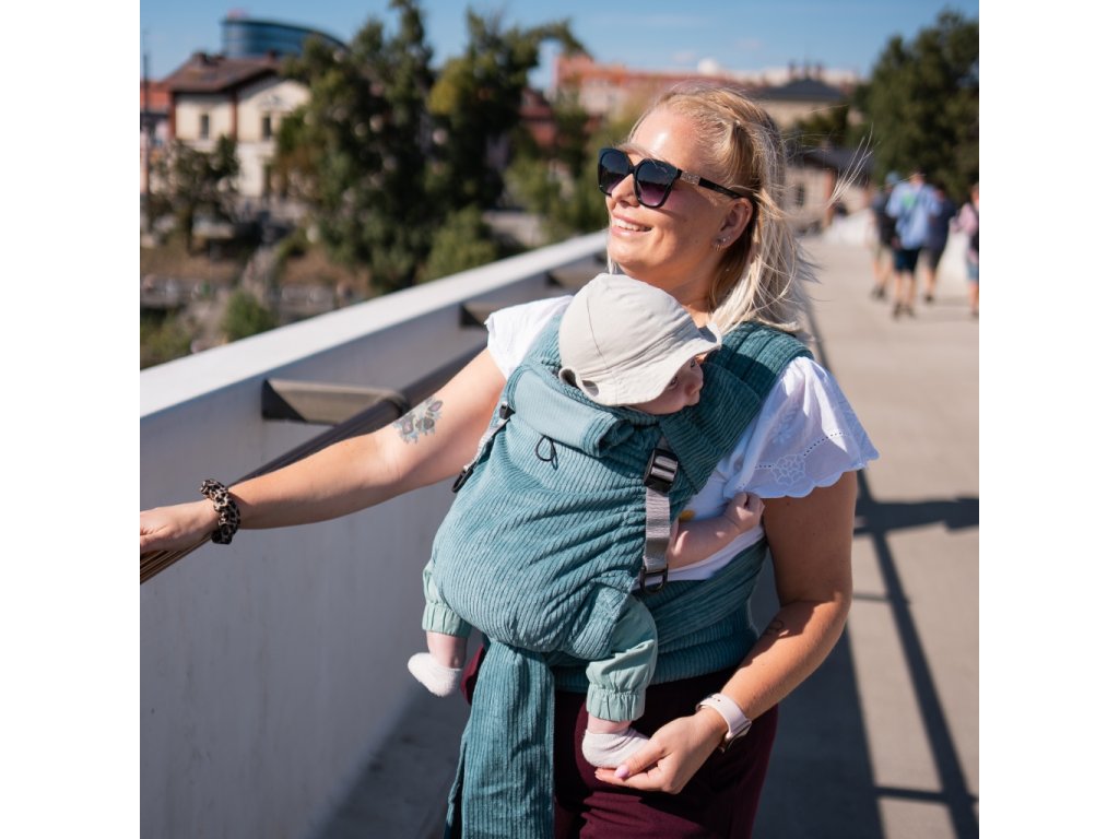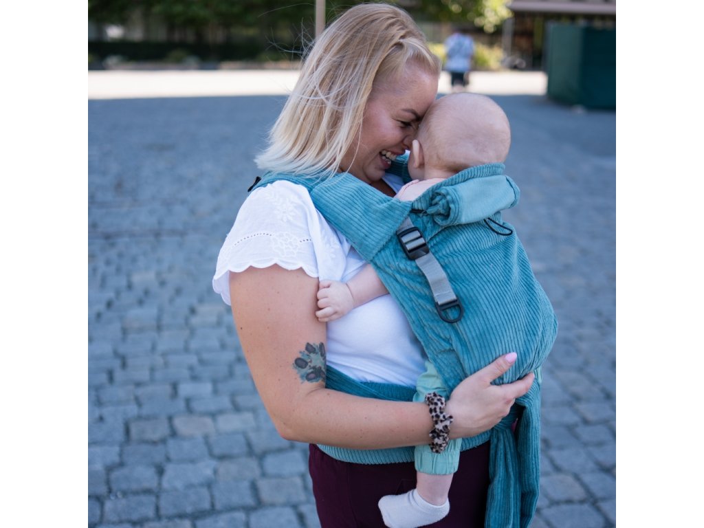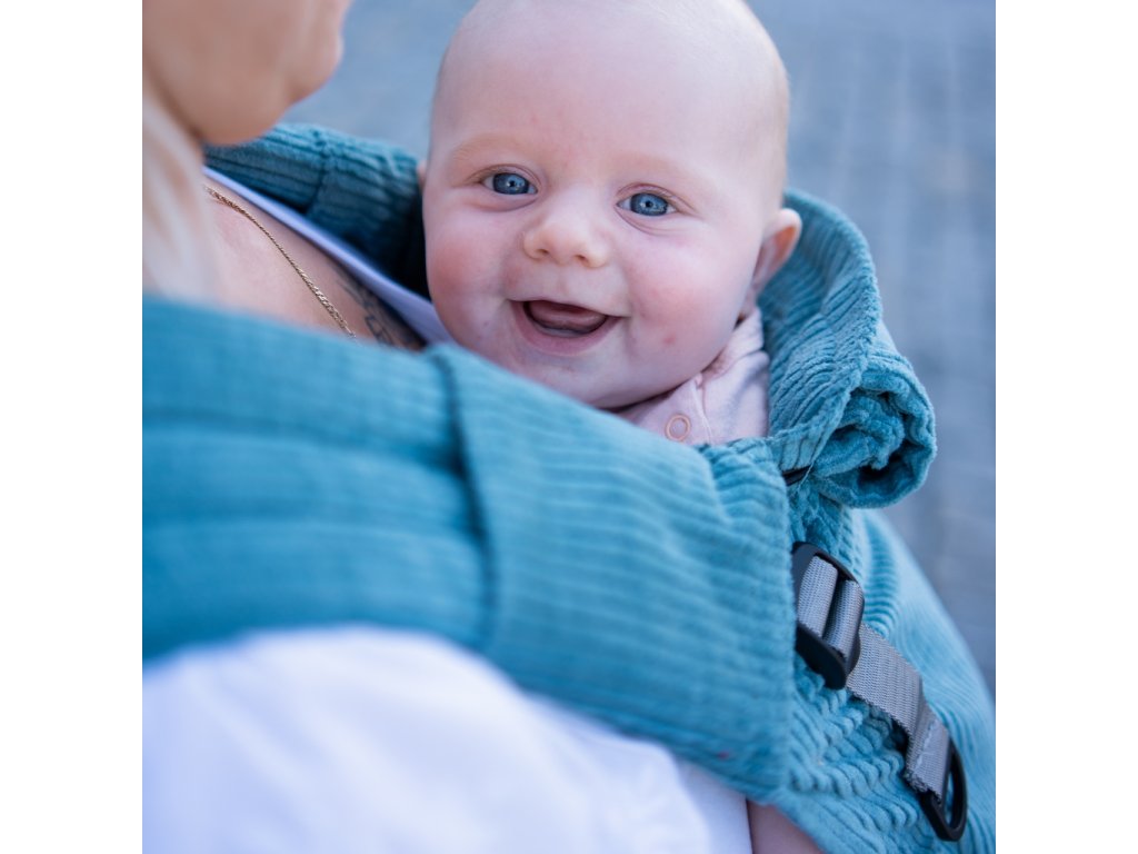 Novorozenecké, rostoucí nosítko Moisha HuGo Manšestr Light Petrol pro děti od narození (cca 47 cm a 2,5 - 3,0 kg) do výšky dítěte cca 80 cm a max. 15 kg.