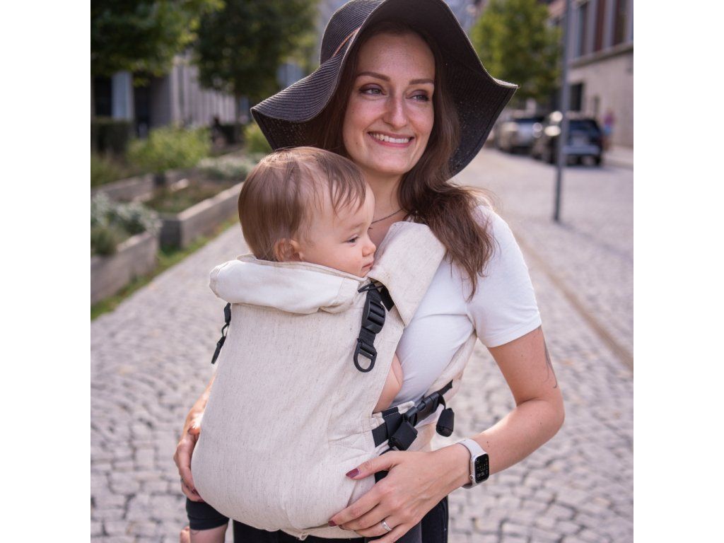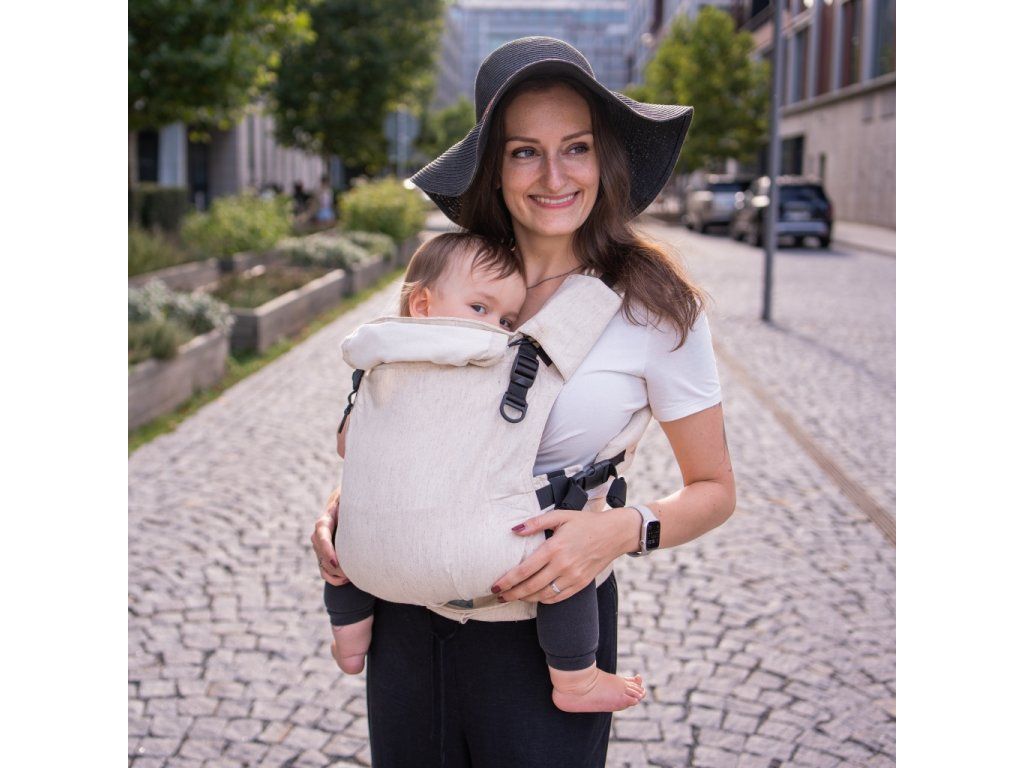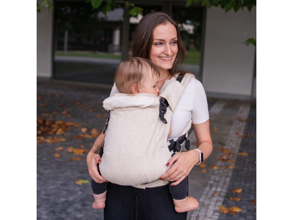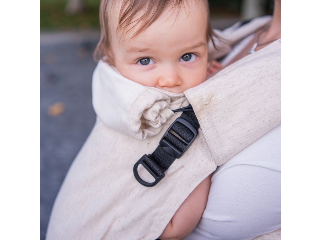 V jednoduchosti je krása - klasická "jednobarevná" látka bez vzoru, pouze přírodní zvýrazněné lněné nopky. Prostě TOP nosítko pro ladění s dalšími kousky oblečení :-)