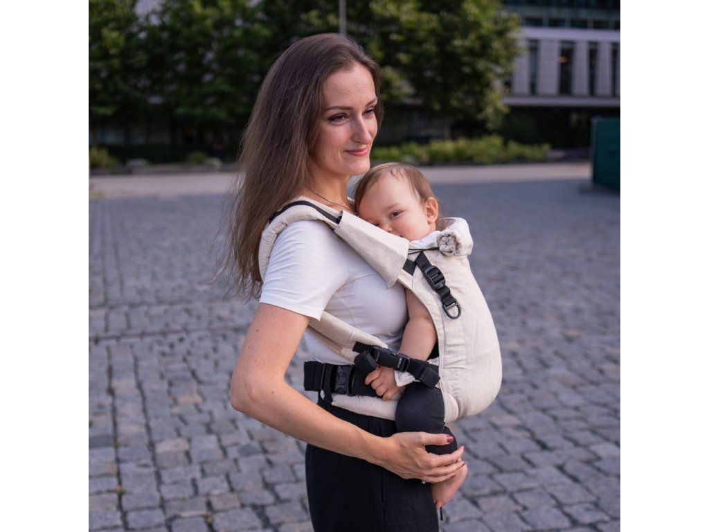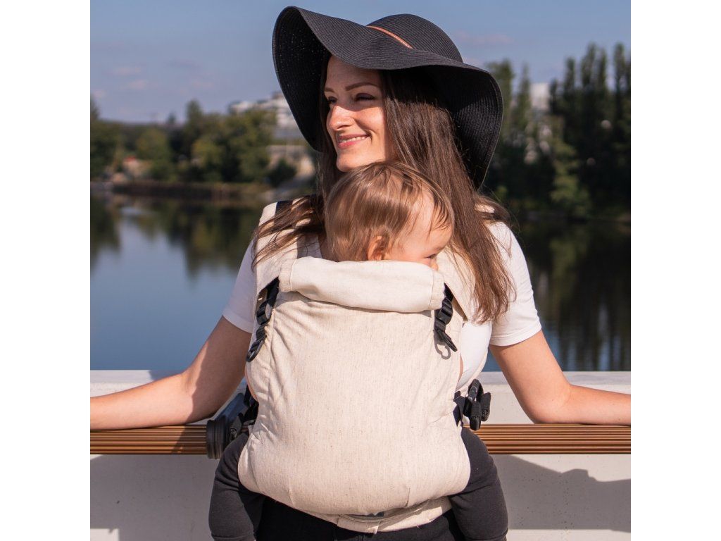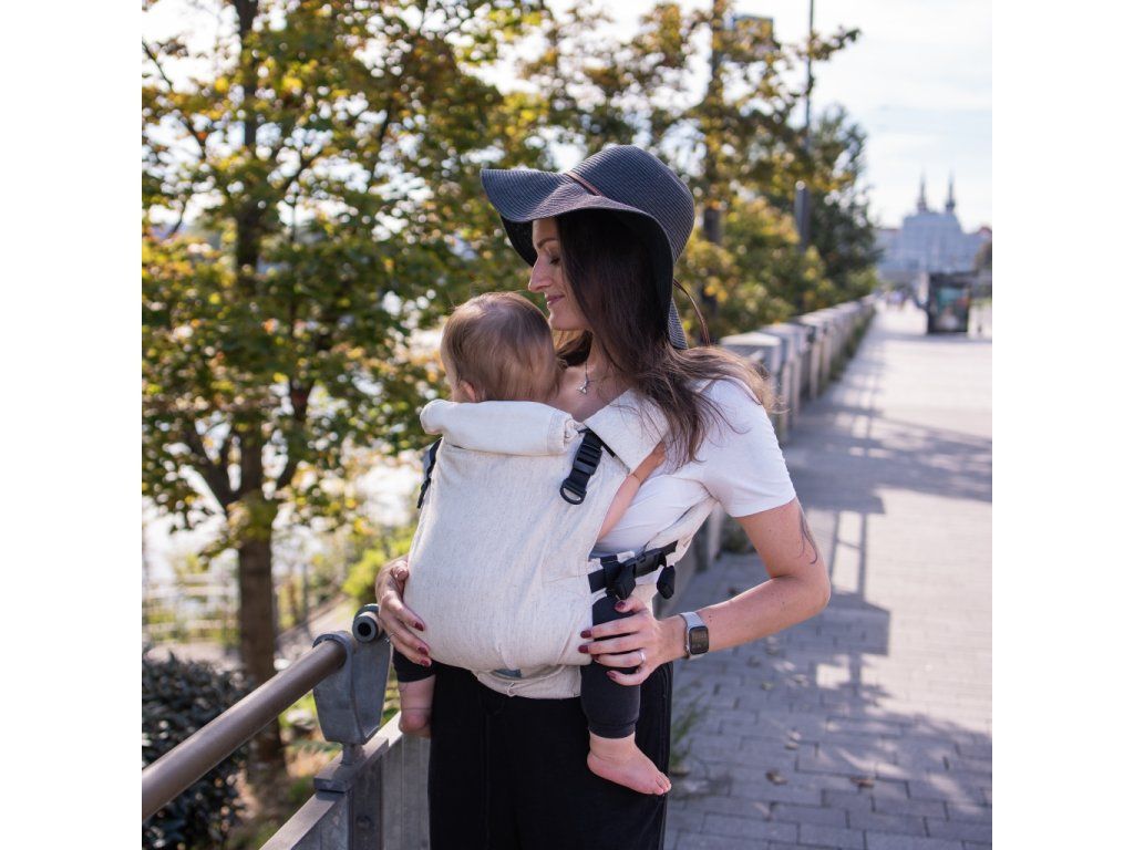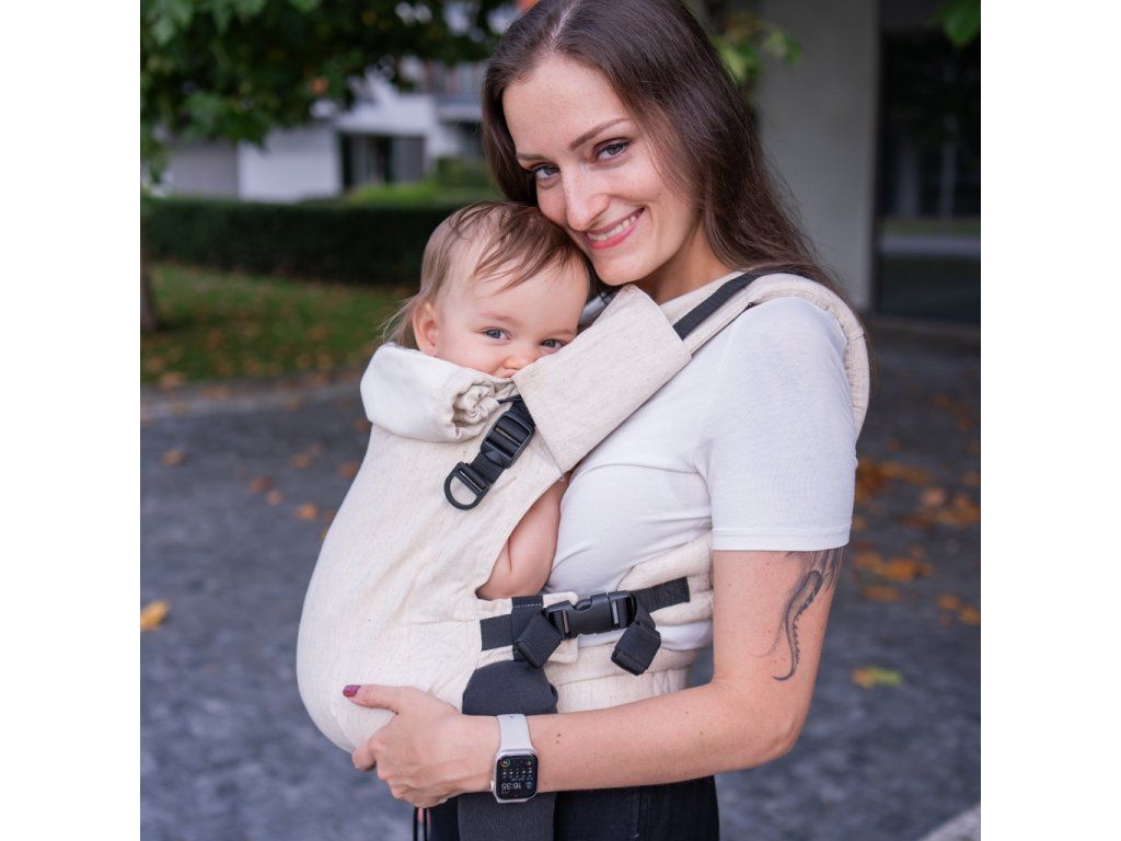 V jednoduchosti je krása - klasická "jednobarevná" látka bez vzoru, pouze přírodní zvýrazněné lněné nopky. Prostě TOP nosítko pro ladění s dalšími kousky oblečení :-)
